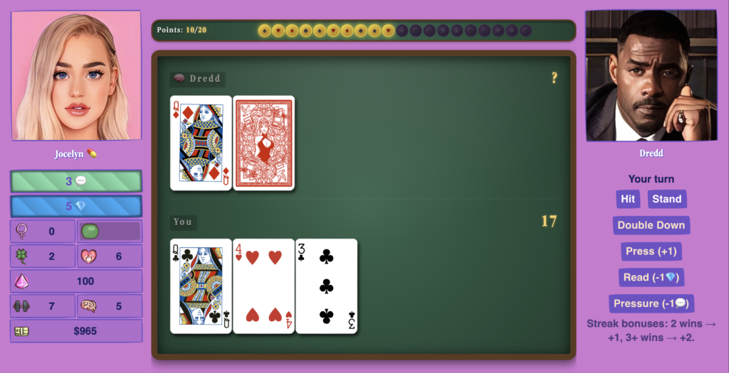 The cards work the same as regular blackjack—2-10 are face value, face cards are 10, Aces count as 1 or 11 (whichever helps). But the person across from you isn’t a casino dealer running on autopilot. They’re playing to beat you, and they have tells, habits, and personalities you can learn to read, depending on your character’s stats!